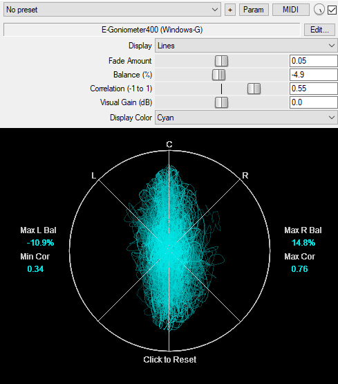 A JSFX Goniometer plugin for REAPER, which is a revamped version of the "JS Goniometer [LOSER]" by Michael Gruhn. It features: