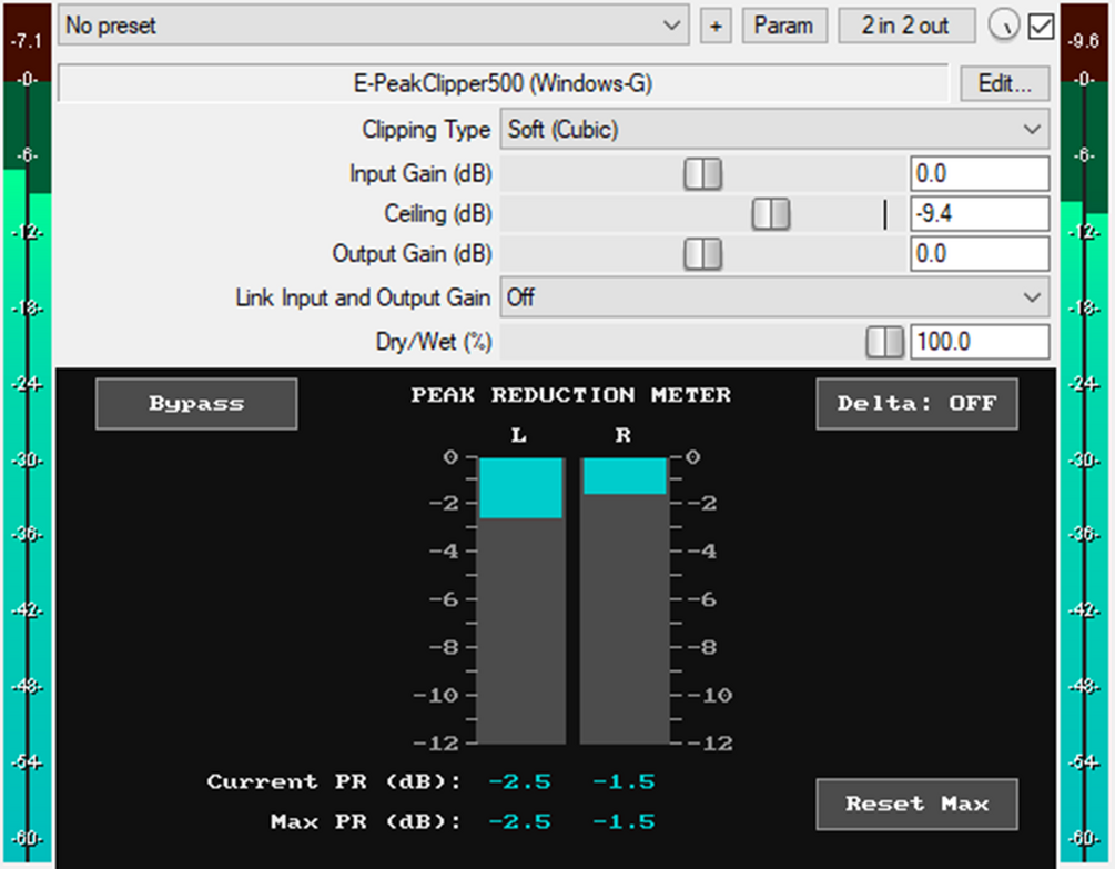 * Maximum Peak Reduction Readouts (dB): Numerical display of the highest amount of clipping since playback started, per channel.