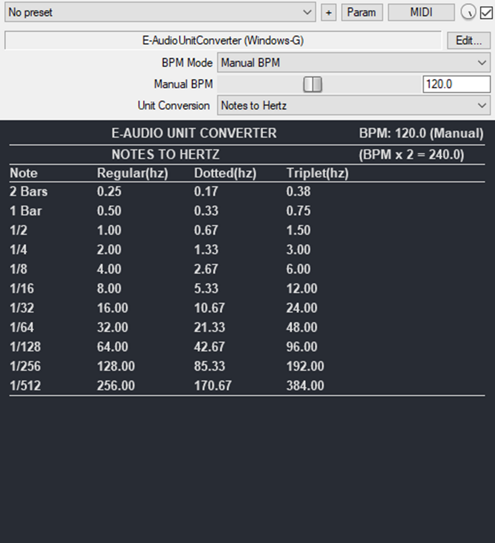 * Musical Note Conversion: converts musical note values into milliseconds, seconds, and Hertz based on your project’s tempo. Perfect for syncing delay, reverb, chorus, phaser, and flanger effects to the beat.