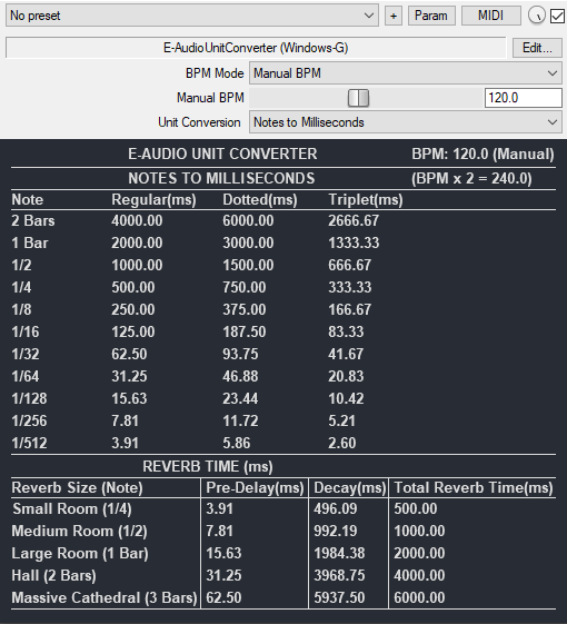 A JSFX plugin for REAPER that converts musical note values into milliseconds, seconds, and Hertz based on your project’s tempo. Designed for syncing delay, chorus, phaser, and flanger effects to the beat. Features BPM detection or manual BPM entry, note-based reverb pre-delay and decay times, custom pre-delay conversion, and near-zero CPU usage.